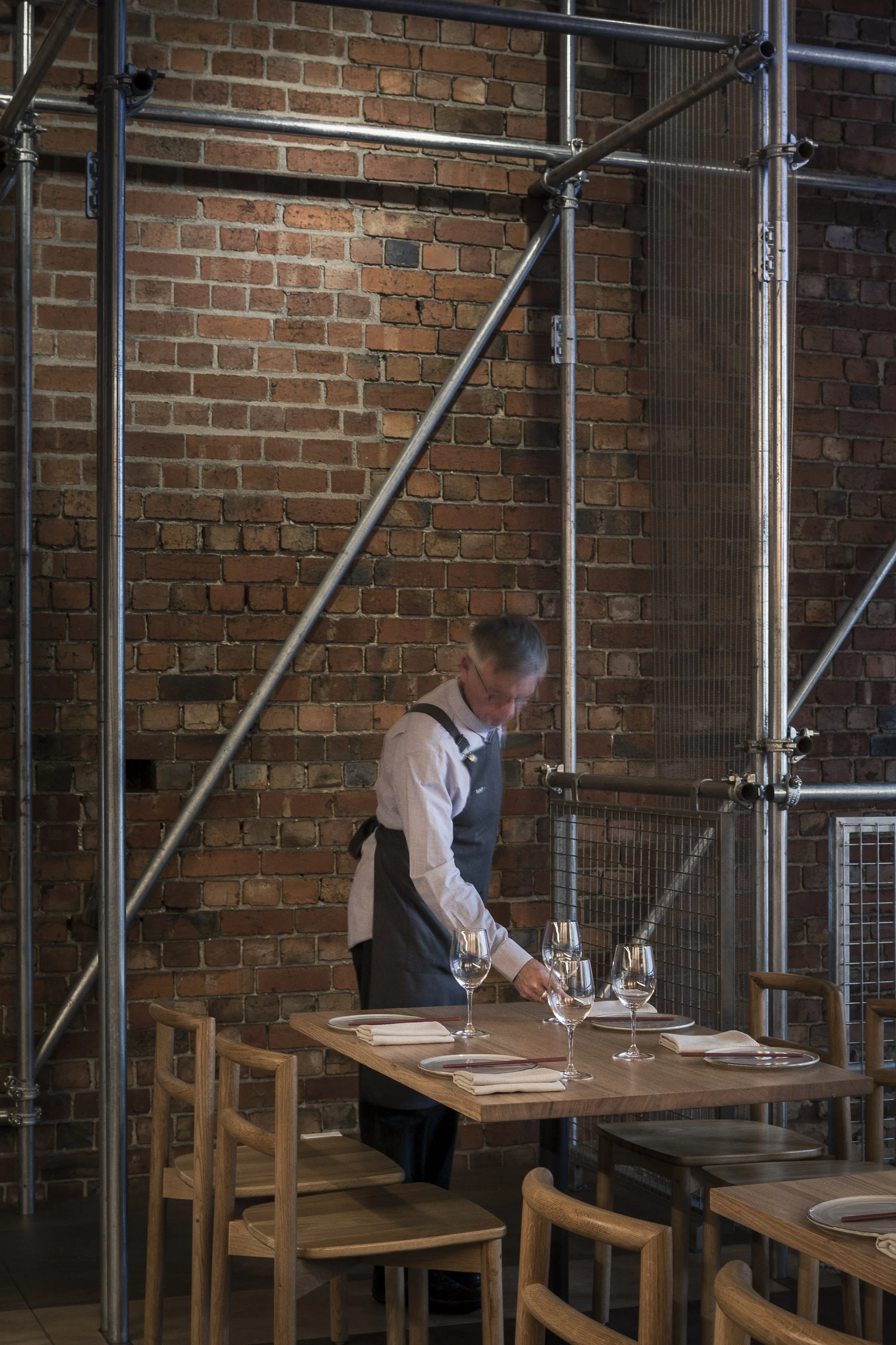 Sunda Dining was conceived as a skeletal scaffold structure that delicately occupies the void between its two existing brick neighbours. The first floor dining appears as a suspended lantern shrouded by layers of woven metal mesh.